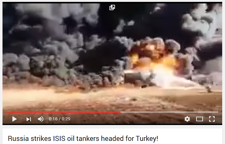 Video of the Convoy on it's way to Turkey.... Published on Dec 5, 2015 https://youtu.be/0cRPJca_h1E The Russian Ministry of Defence released footage on Saturday showing a convoy of oil tankers believed to belong to the so-called Islamic State (IS, ISIS, ISIL) passing through a Syrian-Turkish border gate near the city of Reyhanli. The tankers are also shown passing through a compound, where one building is adorned with a Turkish flag.