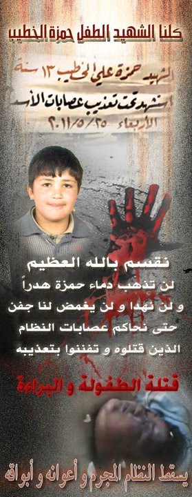 Hamza Khatib was used as target practice. The bullets were not used to kill Hamza but to torture him. Imagine anyone being shot repeatedly in the arms and legs just because someone felt like it – now imagine that “anyone” be a frightened thirteen year old whose only fault was expressing, in the only way that he knows, his opinion in a country where that luxury is not given.